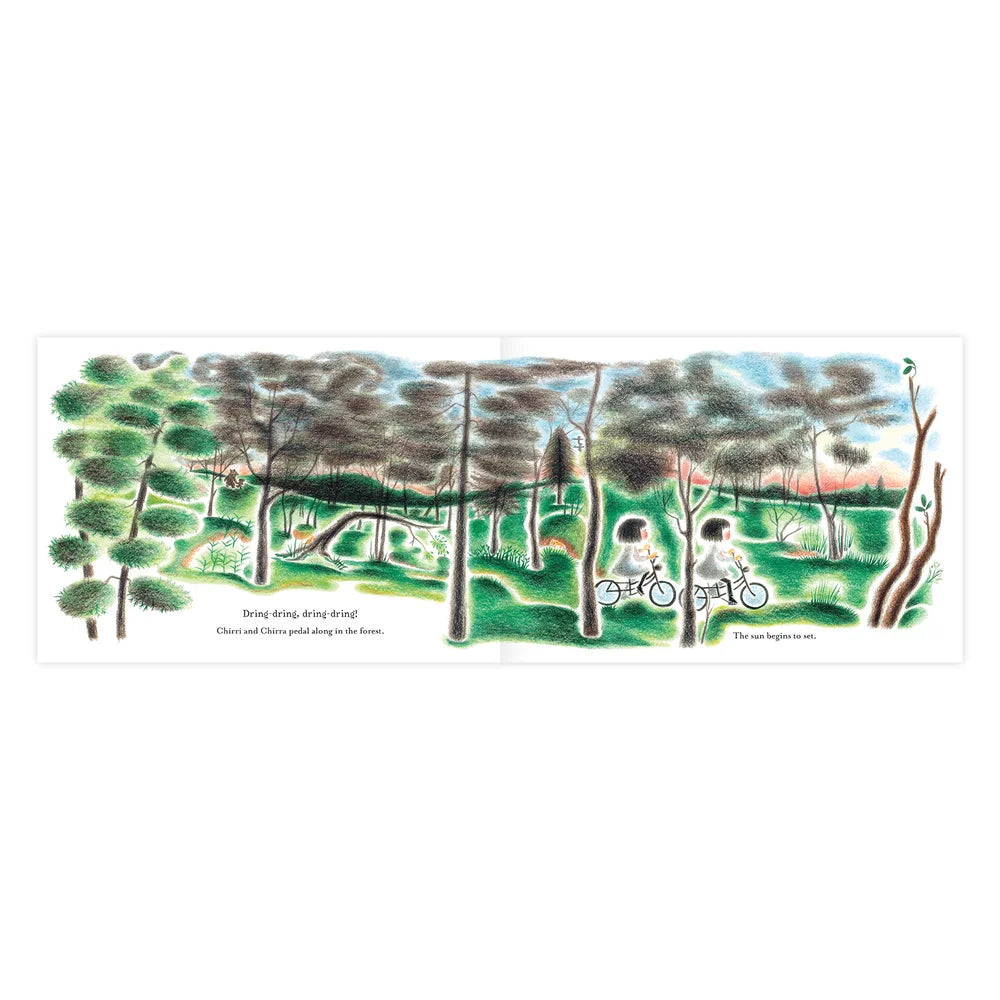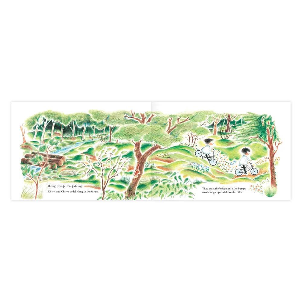 ★ "‘What a perfect day,' says Chirri as this story begins, and she’s right. Chirri and her sister Chirra go on a day-long bike ride through a gently rolling pastoral world. Amenities appear just when they need them: the forest café and the bakery, the bridge over the stream, the tree (perfect for napping under), and, finally, the forest hotel, where an animal symphony concert takes place. Adult humans are completely absent, which leaves room for the fox waiter, the raccoon baker, the pig flautist, and all the other animals of this peaceable kingdom. Creatures of all sizes are accommodated, with tiny teacups for honeybees to drink their sweet violet tea and hotel rooms suitable for all travelers, from lizards to bears. The crayon/ pastel illustrations in gentle, saturated colors on delicious creamy paper are reminiscent of Marie Hall Ets in In the Forest. There’s no tension here, no roadblocks, no problems for the girls to solve, just a summer idyll for those kids who cannot resist making acorns into hats for fairies and whose favorite part of any story is the description of what the characters ate. What does the rabbit have for lunch? Carrot buns with lemon jam. Of course." —STARRED REVIEW, Sarah Ellis, The Horn Book