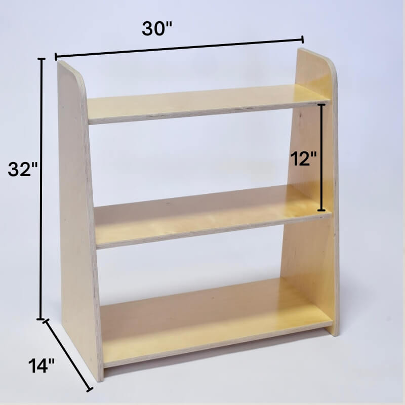 The Toy Shelf has three open shelves. Tiered to simply reach larger toys on lower shelves.